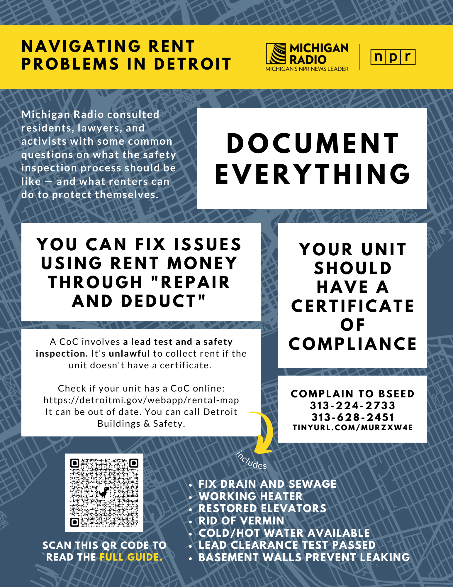 Michigan Radio consulted residents, lawyers, academics, and activists to round up what renters can do to protect themselves when building problems go unaddressed.Problems with your unit? Document, document, document.